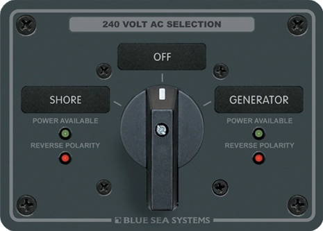 AC kaynak seçme paneli. 240V AC, 65A, kapalı+2 pozisyonlu , 3 kutuplu ağır hizmet tip şalterlidir. 4mm kalınlığındaki panel 133x95mm ebadındadır. Kırmızı ters polarite ledine ve yeşil güç ledine sahiptir.