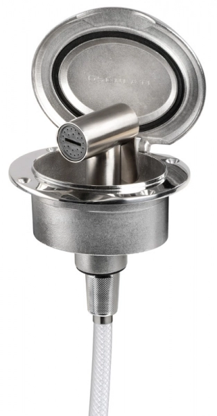 Hortumlu duş ve yuva Osculati Elissa. Kendinden destekli kapaklı AISI316 paslanmaz çelik duş yuvası. Tiger duş başlığı ve titreşim önleyici dahili lastik conta ile donatılmıştır.