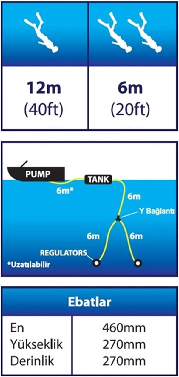 Özellikler Dalgıç sayısı: 1 veya 2 Maksimum derinlik: 1 dalgıç için 12 m : 2 dalgıç için 6 m Kurulum süresi: 2 – 3 dakika Amper: 24 A Volt: 12 V Kompresör: 4 cfm Çalışma basıncı: 25 psi Ağırlık: 18 kg