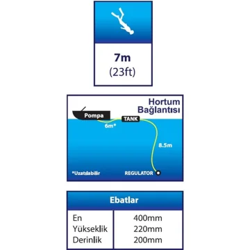 Özellikler Dalgıç sayısı: 1 Maksimum derinlik: 7 m Kurulum süresi: 2 dakika Amper: 12 A Volt: 12 V Kompresör: 2 cfm Çalışma basıncı: 18 psi Ağırlık: 13 kg