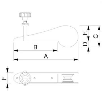 Stainless steel bow roller, dimensions: A: 340 mm, B: 242 mm, C: 165 mm, D: 25 mm, E: 140 mm, F: 78 mm.