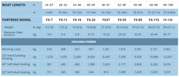 Fortress çıpa, FX-125 model olarak 31.1 kg ağırlığa sahiptir. 45-77 kg muadili demir çıpaya karşılık gelmekte olup, 27-46 metre tekne boyu aralığı için belirtilmiştir. Ölçüleri A: 1422 mm, B: 838 mm ve C: 1143 mm olarak verilmektedir.