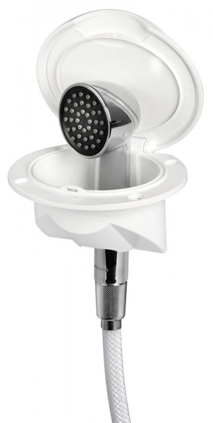 Hortumlu duş ve yuva Osculati Nuvola. AISI316 paslanmaz çelik dekorlu plastik gövde. Düz veya dikey montaj için 45 ° eğimlidir. Keji büyük boy duş başlığı ile donatılmıştır.
