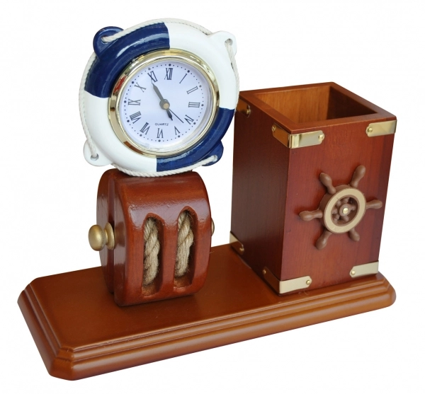 Kalemlik. Makara kaide üzerinde can simidi çerçeveli saat ile birlikte. 22x9.5x18 cm.