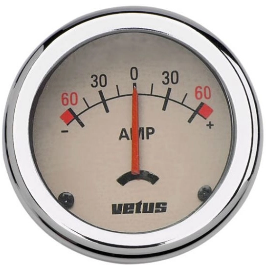 Vetus ampermetre. Vetus ampermetre. 12/24V. +/-60 amper izlenebilir. Ø 52 mm. Kromaj ve siyah olamak üzere iki adet çerçeve standarttır. İhtiyaca göre çerçevelerden herhangi birini kullanabilirsiniz.