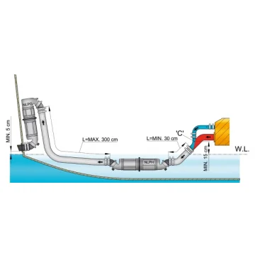Vetus Muffler/Goose Neck, Tip NLPG Vetus Muffler/Goose Neck, Tip NLPG. Muffler ve goose neck fonksiyonlarını birleştirirken iyi bir egzoz sisteminin özelliklerini kaybettirmeden hem kurulum zamanından tasarruf sağlar hem de alandan tasarruf sağlar. Goose neck suyun geri dönüşünü engellerken, muffler da egzoz hattındaki suyu daha fazla karıştırarak, egzoz sesini düşürmeye çalışır. Sonuçlar etkileyici olup, dönüş basıncı neredeyse yok sayılabilir. Bu yeni modelin hem parçaları hem de hortum bağlantıları kolay kurulum sağlayabilmek için tamamen dönebilir özelliktedir. Maksimum sürekli çalışma sıcaklığı 70 °C’dir.
