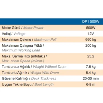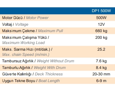 Quick Prince DP1 dik tamburlu ırgat, AISI 316 paslanmaz çelik gövdeye sahip, 500W gücünde ve 12V ile çalışan bir modeldir. 6 mm zincir kavaletası ile uyumludur.