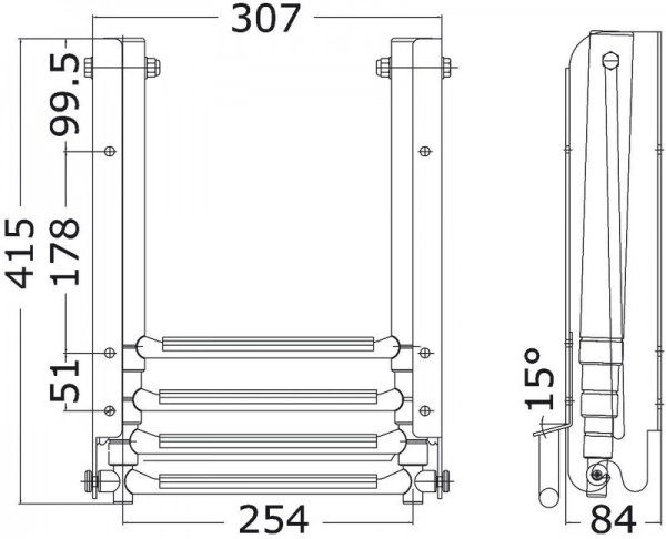 Platformun altına montaj kayar merdiven.  Tutamaklı. Titreşim önleme kilitli. AISI 316 paslanmaz çelik.