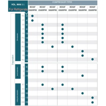 Önerilen örnek evaporatör, hacim, kompresör ve devir oranları aşağıda gösterilmiştir.