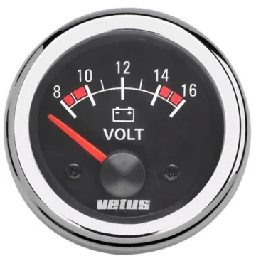 Vetus voltmetre. Vetus voltmetre. Ø 52mm. 10-16V voltajı gösterir. Kromaj ve siyah olmak üzere iki adet çerçeve standarttır. İhtiyaca göre çerçevelerden herhangi birini kullanabilirsiniz.
