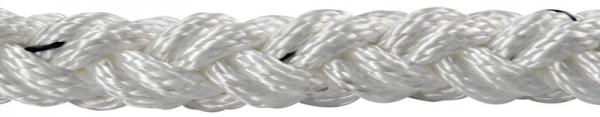 Ø 12 mm, 2000 kg kopma yüküne sahip, 8 kollu, örgülü, beyaz polyester halat.