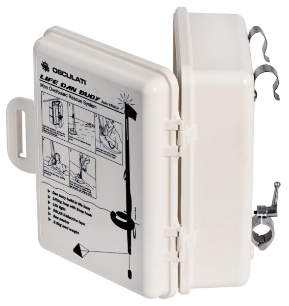 Kurtarma sistemi, sağlam bir ABS kutuya sığdırılmıştır. Denize birinin düşmesi durumunda, anında konuşlanabilmesi için Ø 25 mm pulpite asılı olan kutuyu açın ve suya atın. Denizdeki kişi şişirilmiş bir kurtarma cihazının yanı sıra oldukça görünür bir direk ve ışık bulacaktır. Halkalı cankurtaran simidi ve yerleşik 260 cm'lik direk, yüzer çıpa, acil durum ışığı, yansıtıcı bant, ağırlık ve kayış içerir. Yüzerlik 275N. 290x230x125 mm. 4.8 kg.