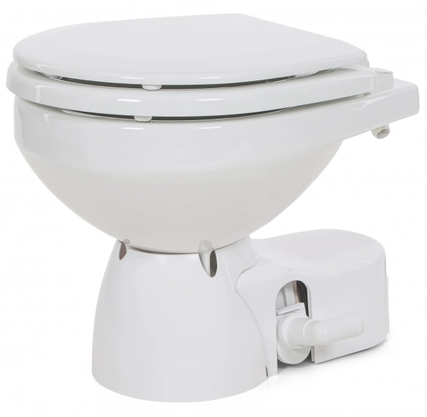 Ham su ile sifon için Quiet Flush E2 elektrikli tuvalet, 12V veya 24V 11 L/Dakika kapasiteli Jabsco Par-Max 3 durulama pompası, filtre ve ½ inç (15 mm) hortum portları içerir.