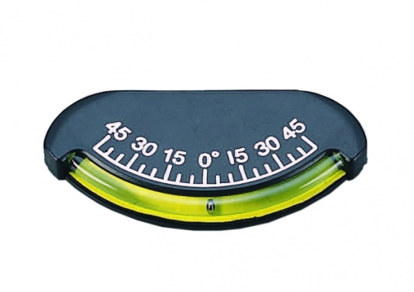 Klinometre, paslanmaz çelik bilyalı ve kendinden yapışkanlıdır, montaj için vida vs. gerektirmez. Sancak/iskele 0°-45°. 89x38 mm.