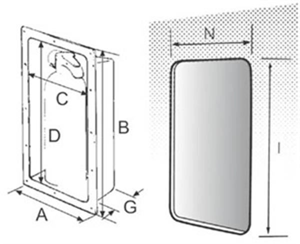 Nuova RADE yangın söndürücü yuvası, 1 kg kapasiteli yangın söndürücüler için tasarlanmış, şeffaf kapaklı bir modeldir. Ürün, farklı montaj ihtiyaçlarına uygun detaylı ölçü bilgileriyle birlikte sunulmaktadır.