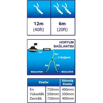 Hortumlar • 1 m (pompadan hava rezervuarına) • 6 m (rezervuardan Y regülatöre) • 6 m (Y parçadan 1. Dalgıca) • 6 m (Y parçadan 2. Dalgıca)